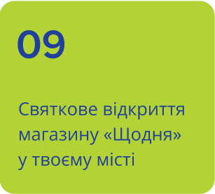 БУДУЙ З НАМИ Мережу сімейних маркетів «Щодня» Даруй радість від приємних покупок Придбати франшизу Наш асортимент охоплює ПОБУТОВА ХІМІЯ КОСМЕТИКА ЗАСОБИ ГІГІЄНИ ТЕКСТИЛЬ ПОСУД ПРОДУКТИ ХАРЧЮВАННЯ ДРІБНІ ЕЛЕКТРОПРИЛАДИ ТОВРИ ДЛЯ ДОМУ ЗООТОВАРИ Ось так виглядатиме твій магазин СУЧАСНО ДРУЖНЬО АКТУАЛЬНО Реалізуй свої ідеї Реалізуй свої бажання Реалізуй свої в реальний бізнес Загальні умови франшизи Прибуток франчайзі від 100 000 грн Окупність інвестицій від 18 міс. Сума інвестицій від 2млн грн Паушальний внесок 10 000 грн Роялті 1% Вихід на точку беззбитковості 1-2 міс. Ми маємо все для твого успіху в бізнесі Хто твій покупець Наш покупець — це турботлива людина, яка щодня обирає якість, зручність і доступну ціну для себе чи своєї родини МАМА ДИТИНА РОДИНА СУСІДИ Що тобі потрібно для відкриття Площа приміщення від 130 м2 Жага мати власний магазин Бажання піклуватися про свого покупця Цінності: доброзичливість, повага, прозорість, першокласний сервіс Штат: 3-5 працівників Від нас ти отримуєш Покрокову програму впровадження франшизи Підтримку і допомогу на кожному кроці Шлях до відкриття Стань частиною нашої великої історії Ми будуємо свою репутацію на поєднанні якості, доступності та широкого вибору ContaktІм'яТелефонНадіслати